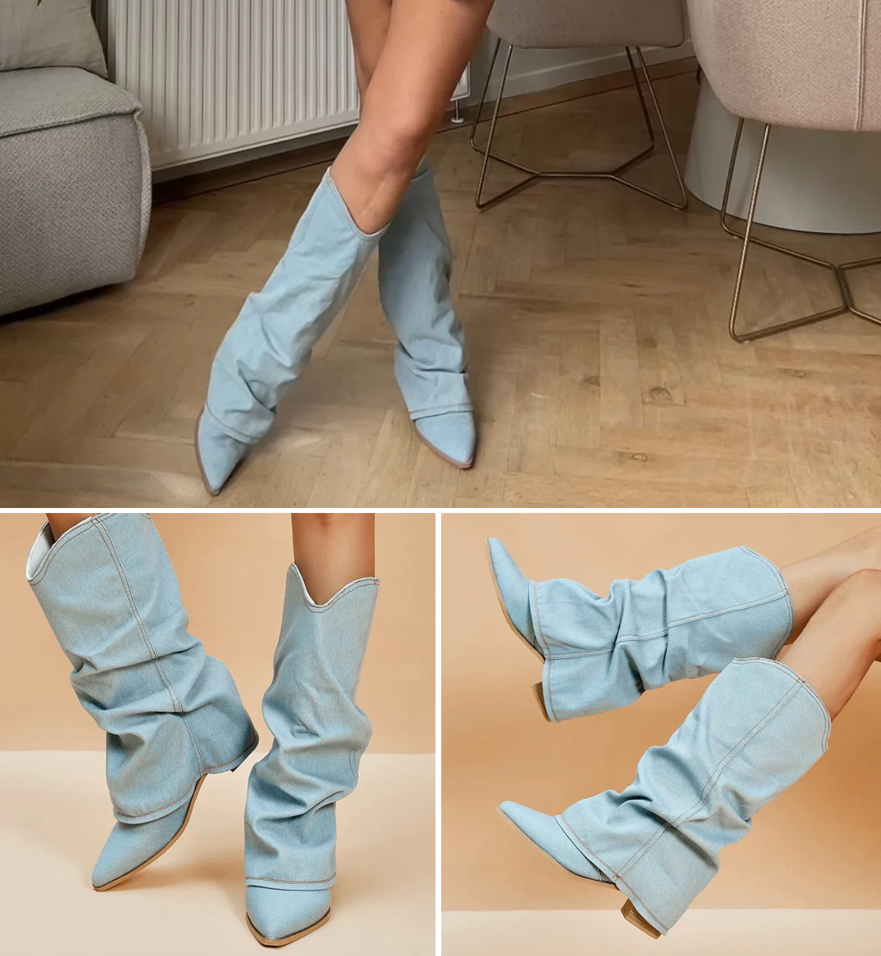 Damen tragen hellblaue Denim-Stiefel mit spitzen Zehen und Faltenoptik. Modetrend, stilvolle Schuhe, lässiger Look, Holzboden, Innenraum.