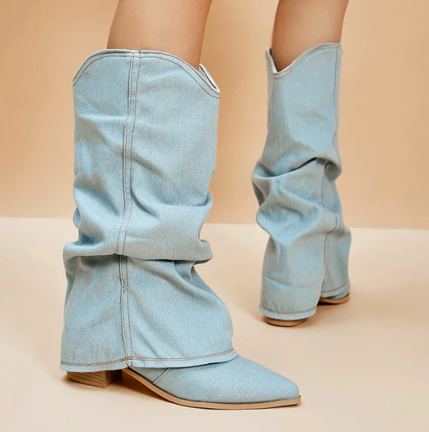 Damen Stiefel aus hellblauem Denim, spitze Zehen, niedriger Absatz, modisch, lässig, ideal für Herbstmode und Streetstyle.