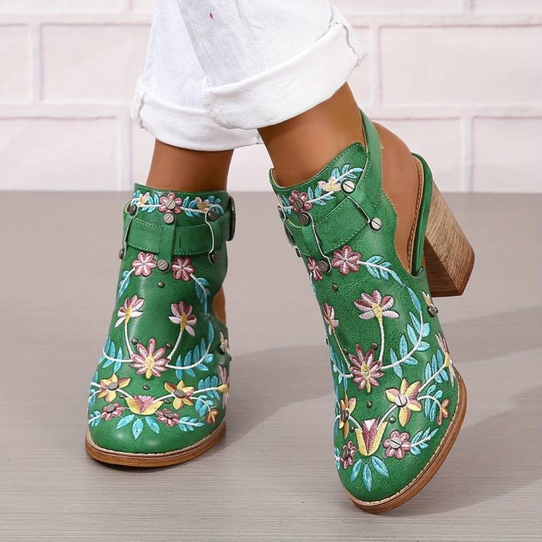 Schlüpfen Sie in die Eleganz mit unseren orthopädischen Stiefeletten mit Blockabsatz, die durch ein geschlossenes Zehen-Design und einen Slingback-Riemen überzeugen. Die Stiefeletten sind mit wunderschöner bestickter Blumendekoration verziert, die jeden Schritt verschönert.