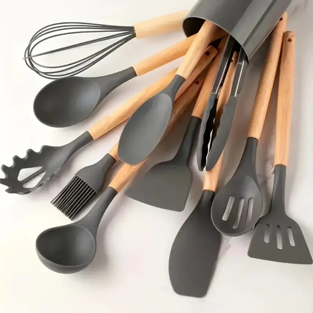 Silikon Küchenutensilien Set | Hitzebeständiges 12-teiliges Kochgeschirr mit Bambusgriffen