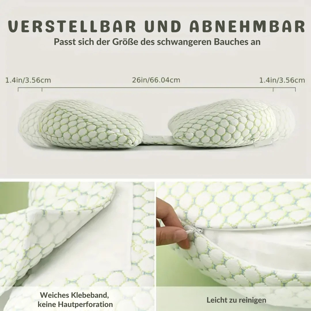 Das Schwangerschaftskissen wurde speziell entwickelt, um den wachsenden Bauch und den Rücken zu stützen. Die Bauchstütze verhindert das Einsinken in die Matratze, während die Rückenstütze dafür sorgt, dass du sicher auf der Seite schläfst, ohne unbewusst auf den Rücken zu rollen. So verbessert sich die Schlafqualität und Rückenschmerzen werden reduziert – entscheidend für dein Wohlbefinden und das deines Babys.