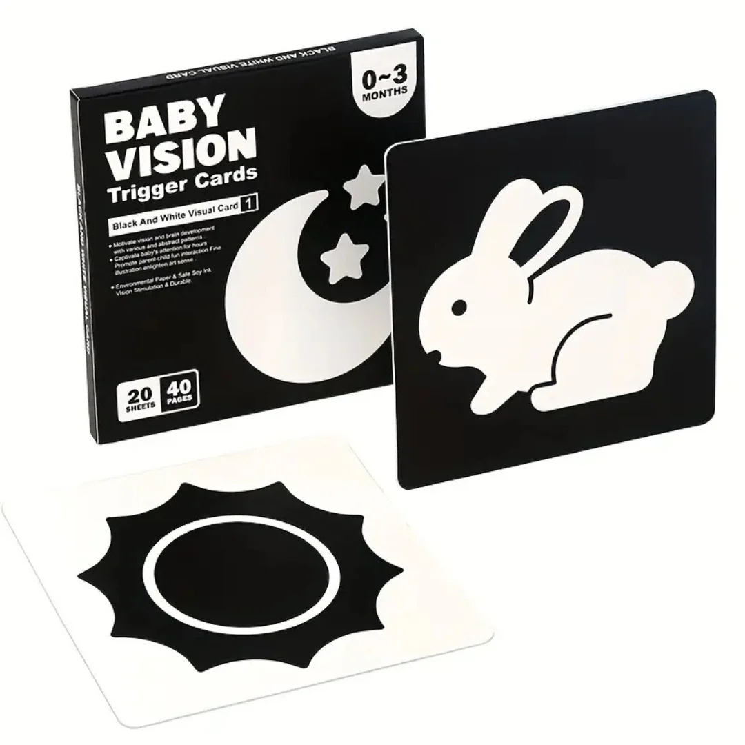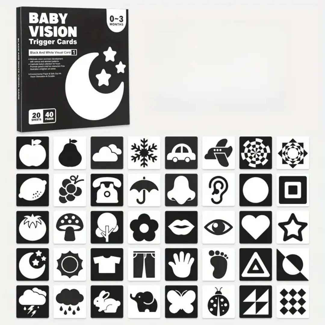 🖋️ Baby's Erste Schwarz-Weiß-Bildkarten sind der perfekte Einstieg für die Allerkleinsten! Dieses Set visueller Karten fördert die Entwicklung des Sehvermögens und hilft deinem Baby dabei, die Welt um sich herum zu entdecken. Die kontrastreichen Schwarz-Weiß-Illustrationen unterstützen die visuelle Fokussierung und das Erkennen neuer Formen und Muster. 👶✨