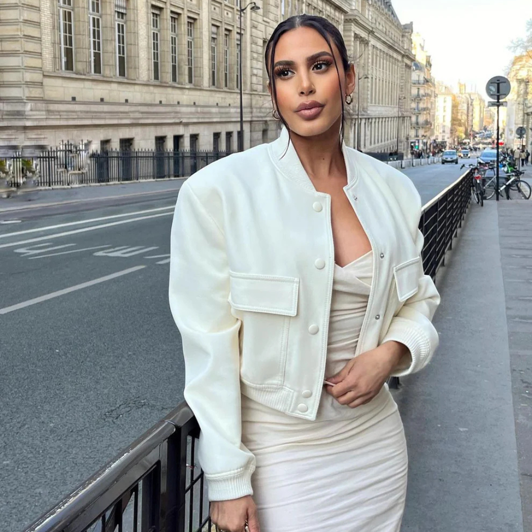 Entdecken Sie unsere elegante Bomberjacke für den Herbst – die perfekte Übergangsjacke mit Brusttaschen für Damen mit sophistiziertem Design. Diese hochwertige elegante Bomberjacke Damen kombiniert klassischen Bomber-Style mit raffinierten Details und ist die ideale Herbstjacke Damen für stilvolle Business-Casual-Outfits in der Übergangszeit.
