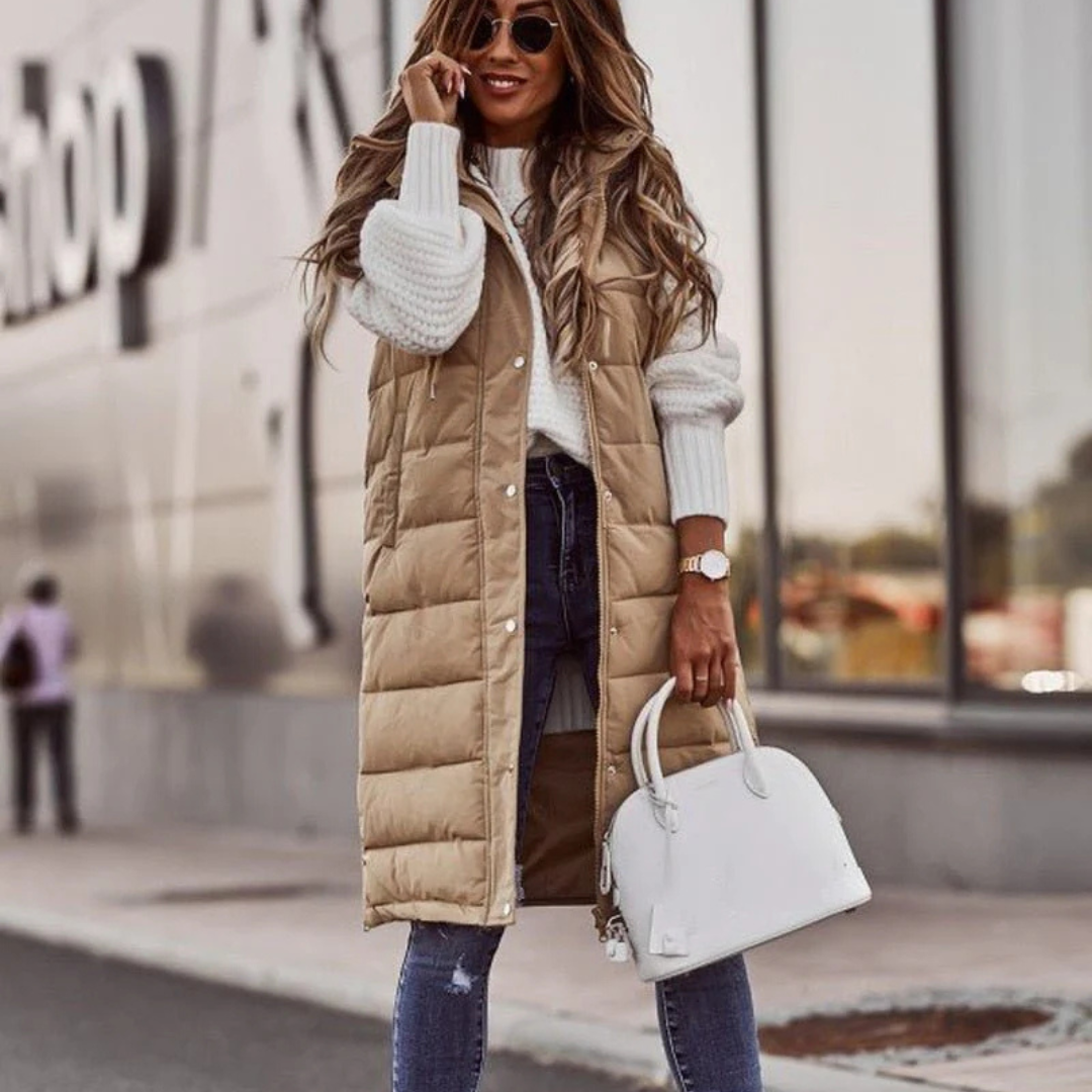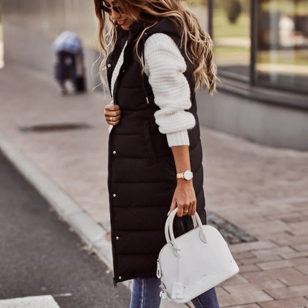 Entdecken Sie unsere leichte lange Steppweste für kalte Tage – die perfekte Daunenweste mit Kapuze für Damen mit optimaler Wärmefunktion. Diese hochwertige lange Steppweste Damen kombiniert modernen Kälteschutz mit leichtem Design und ist die ideale Winterweste Damen für stilvolle Layering-Looks an kalten Tagen.