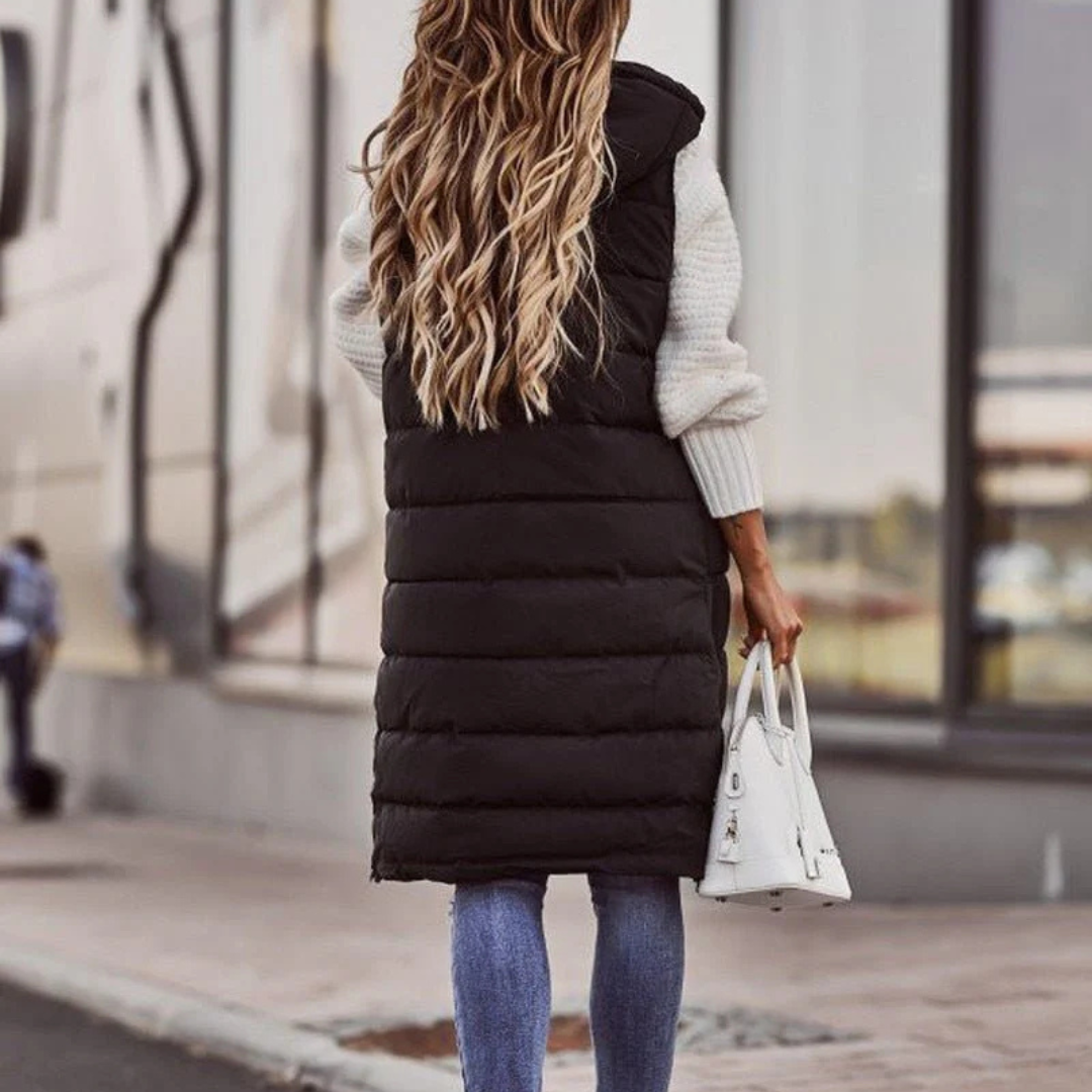 Steppweste für kalte Tage - Leichte lange Daunenweste mit Kapuze für Damen